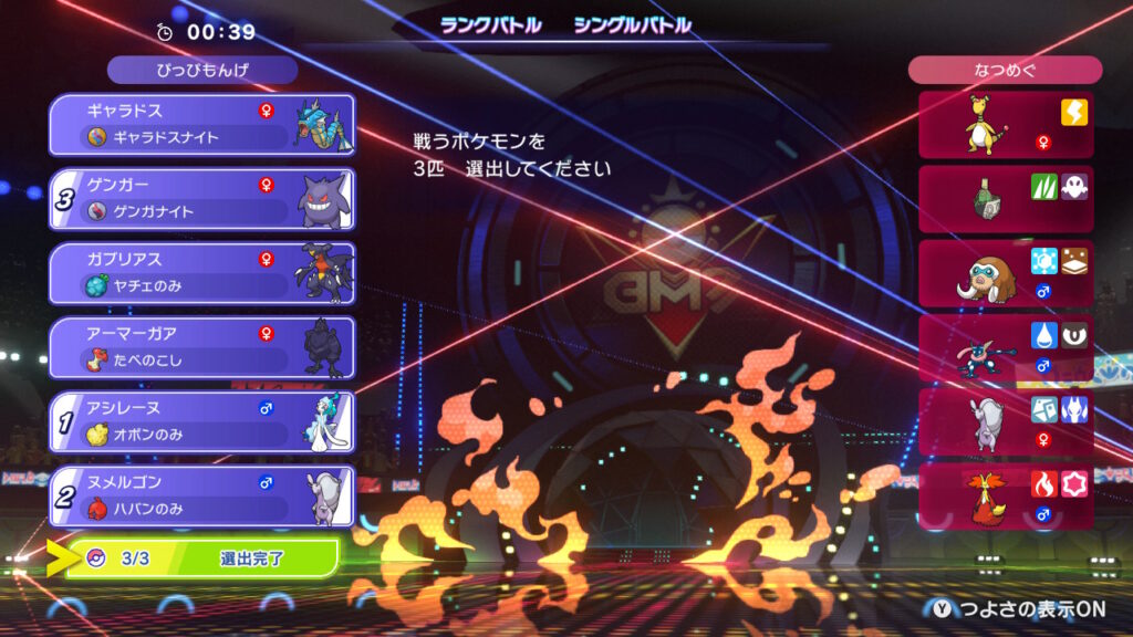あと、メイン選出とサブ選出において両方メガシンカが使えたほうが有利なので、そこも意識した。