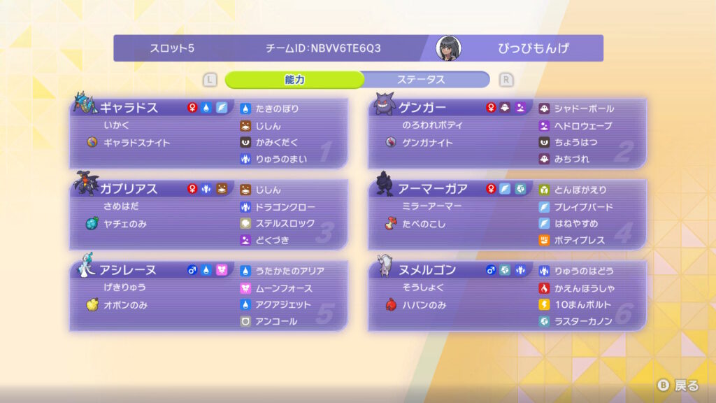 - 中盤:ドヒドイデ居座り(どくどく・どくびし・トーチカ・じこさいせい)→ 攻撃技なし+かげふみで拘束からのシャドーボール連打で突破